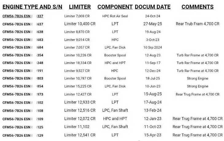 16台CFM56-7B26涡扇发动机出售,SV状态;Limiter 范围从 7,000 Cy 到 ~18,000 Cy!